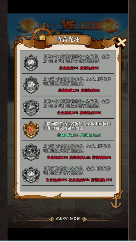 玩家需巧妙構(gòu)建戰(zhàn)斗陣容,依據(jù)不同戰(zhàn)局靈活調(diào)配角色,憑借策略與絕技征服對(duì)手,享受燒腦且激爽的戰(zhàn)斗快感。隊(duì)伍中可以編入6名角色,角色有4種陣營(yíng)和4種定位。陣營(yíng)分為世界政府、新星團(tuán)、大海賊、海軍和五皇;定位分為輔助、肉盾、輸出、控制。陣營(yíng)之間沒(méi)有克制效果,會(huì)根據(jù)上陣中同陣營(yíng)的英雄數(shù)量獲得傳說(shuō)之力的加成。戰(zhàn)斗的攻擊順序是根據(jù)在布陣的站位1-6號(hào)進(jìn)行,雙方一號(hào)角色會(huì)優(yōu)先行動(dòng)以此類推,可以根據(jù)你隊(duì)伍中6名角色的定位設(shè)置合理的排陣出手順序。